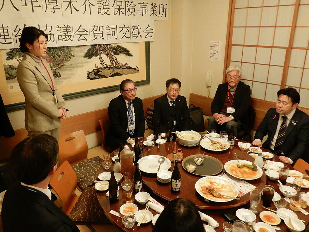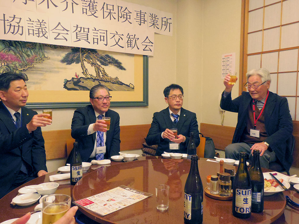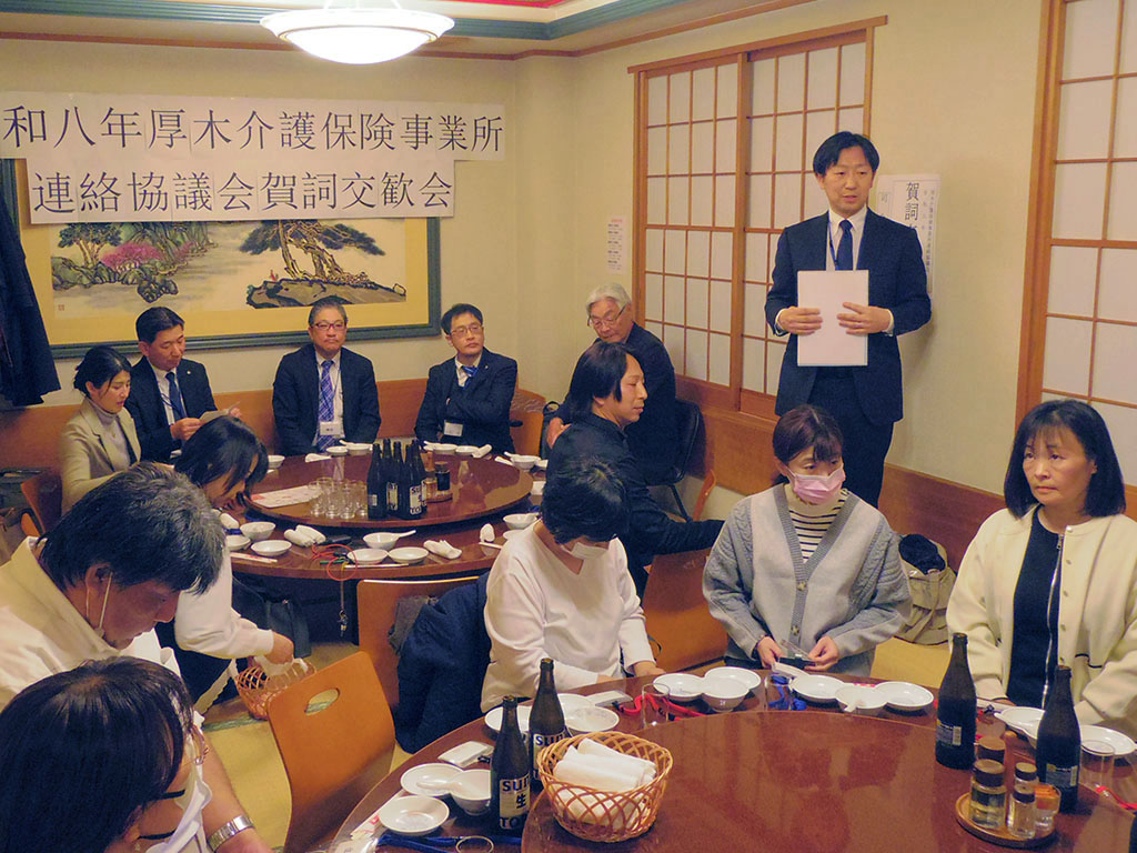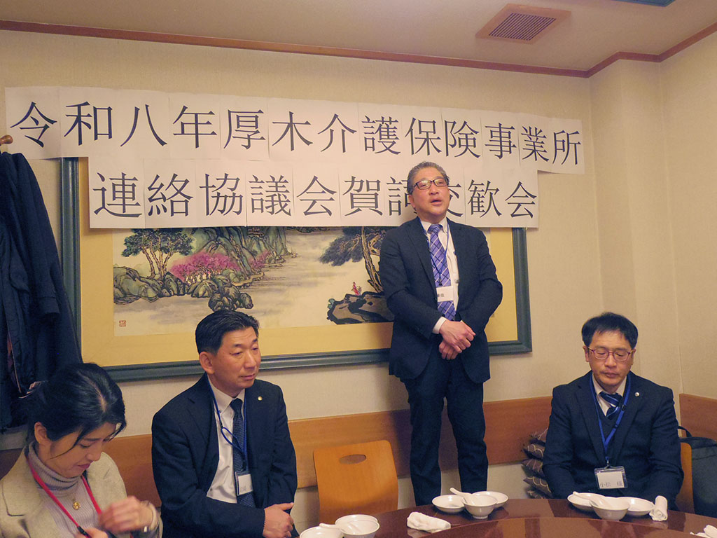 みなさまにはお忙しい中お集まりいただき、年の始まりを皆さんとお祝いできたことに感謝申し上げます。 私ども訪問のサービスを提供する中で、人材不足や介護者の高齢化など業界の厳しさを感じることもあります。本日いろいろな方からお話し頂いたように、介護のことを真剣に考えている方がたくさんいらしゃることが感じられ良かったです。介護に関わる方は「利用者さんのためになりたい」という気持ちがあってこそ続けていられると思います。この気持ちを忘れずに、自身の心と健康も保ちながら、お仕事を続けていきたいと思います。これからも多くの方からアドバイスをもらったり、困っている時に助け合ったりできるこの会を続けていきたいと思います。